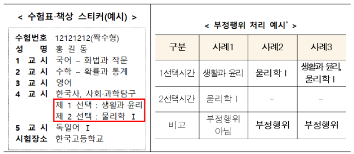 * [생활과 윤리]가 제1선택과목, [물리학Ⅰ]이 제2선택과목인 수험생이 1선택 시간에 [물리학Ⅰ]을 풀거나(사례2), 1선택 시간에 [생활과 윤리]와 [물리학Ⅰ] 문제지를 동시에 푸는 경우(사례3) 부정행위로 처리됨