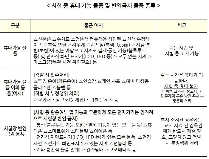 【 시험장 반입금지 물품은 집에 두고 오거나, 1교시 시작 전 반납 】