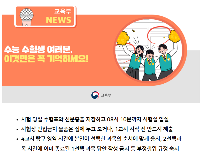 교육부(장관 최교진)는 11월 13일(목)에 실시될 2026학년도 대학수학능력시험 수험생 유의 사항을 안내한다.