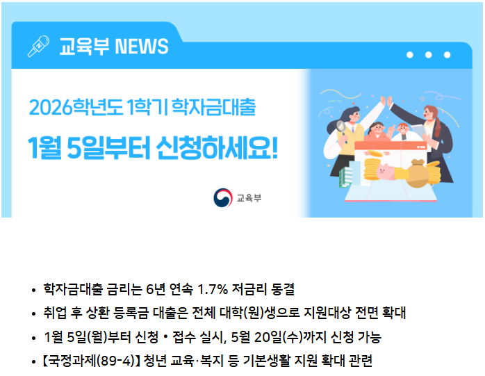 [출처] 2026학년도 1학기 학자금대출 1월 5일부터 신청하세요!|작성자 교육부