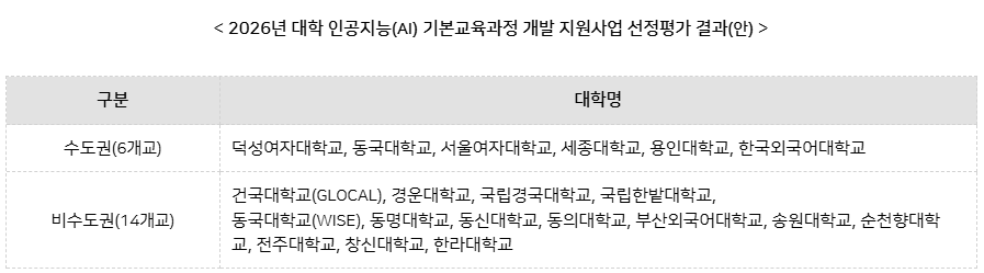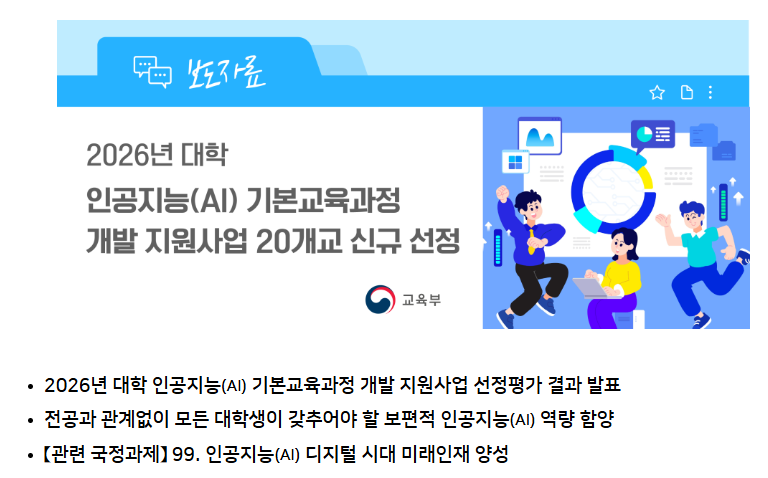 교육부(장관 최교진)와 한국대학교육협의회(회장 이기정)는 4월 23일(목) ‘2026년 대학 인공지능(AI) 기본교육과정 개발 지원사업’ 선정평가 결과를 발표하였다.